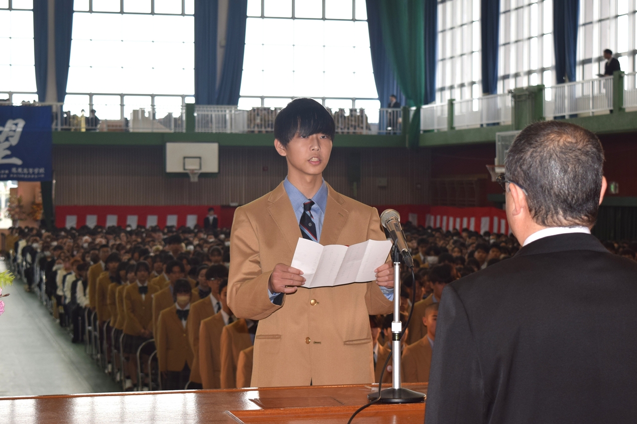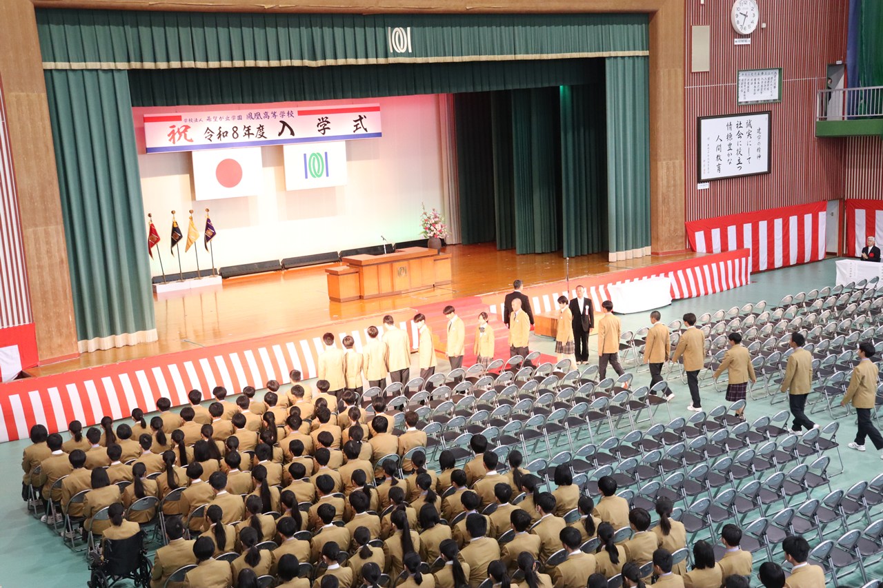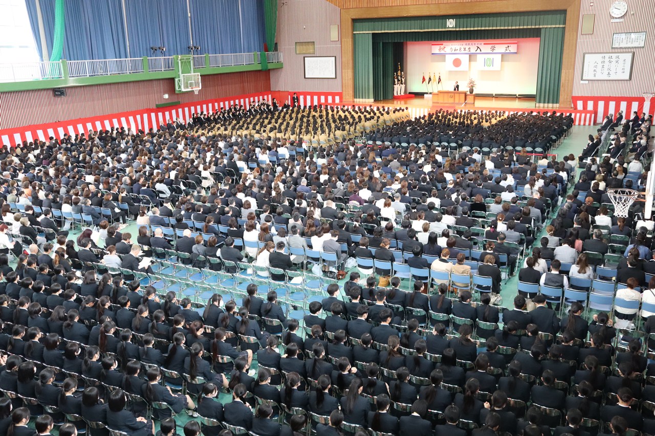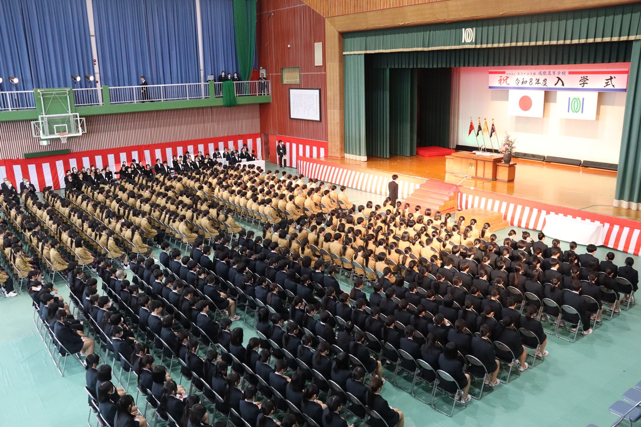 高校新入生の皆さんは、緊張しながらも希望に満ちた表情で保護者、在校生に迎えられました。