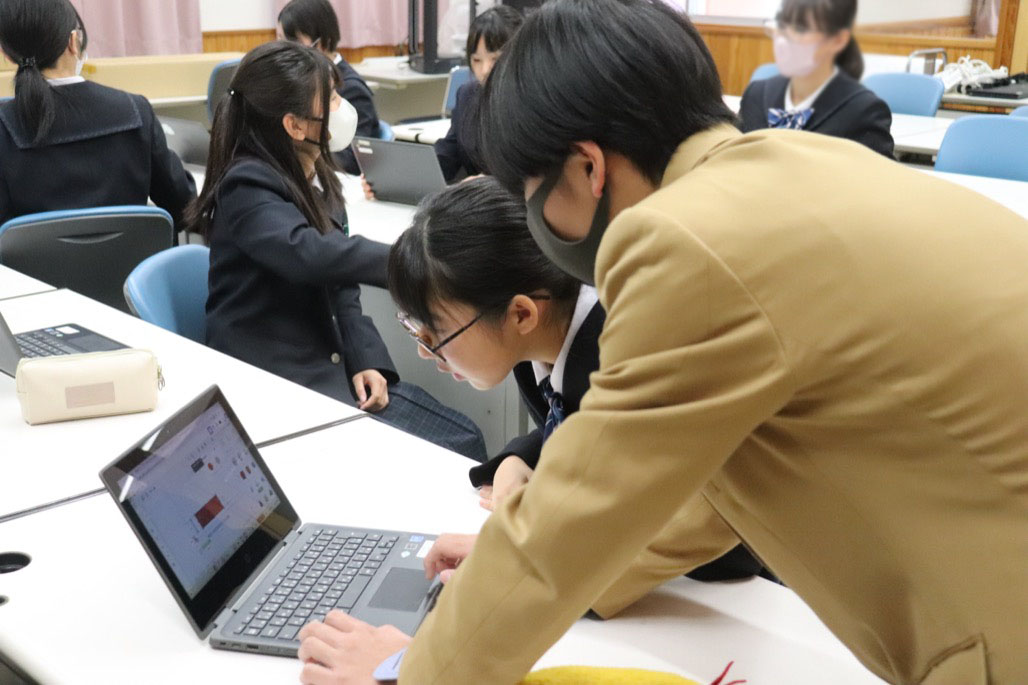 未来探究コースとビジネス探究コースから生徒1名ずつ協力をいただき、中学生のサポートをおこないました。