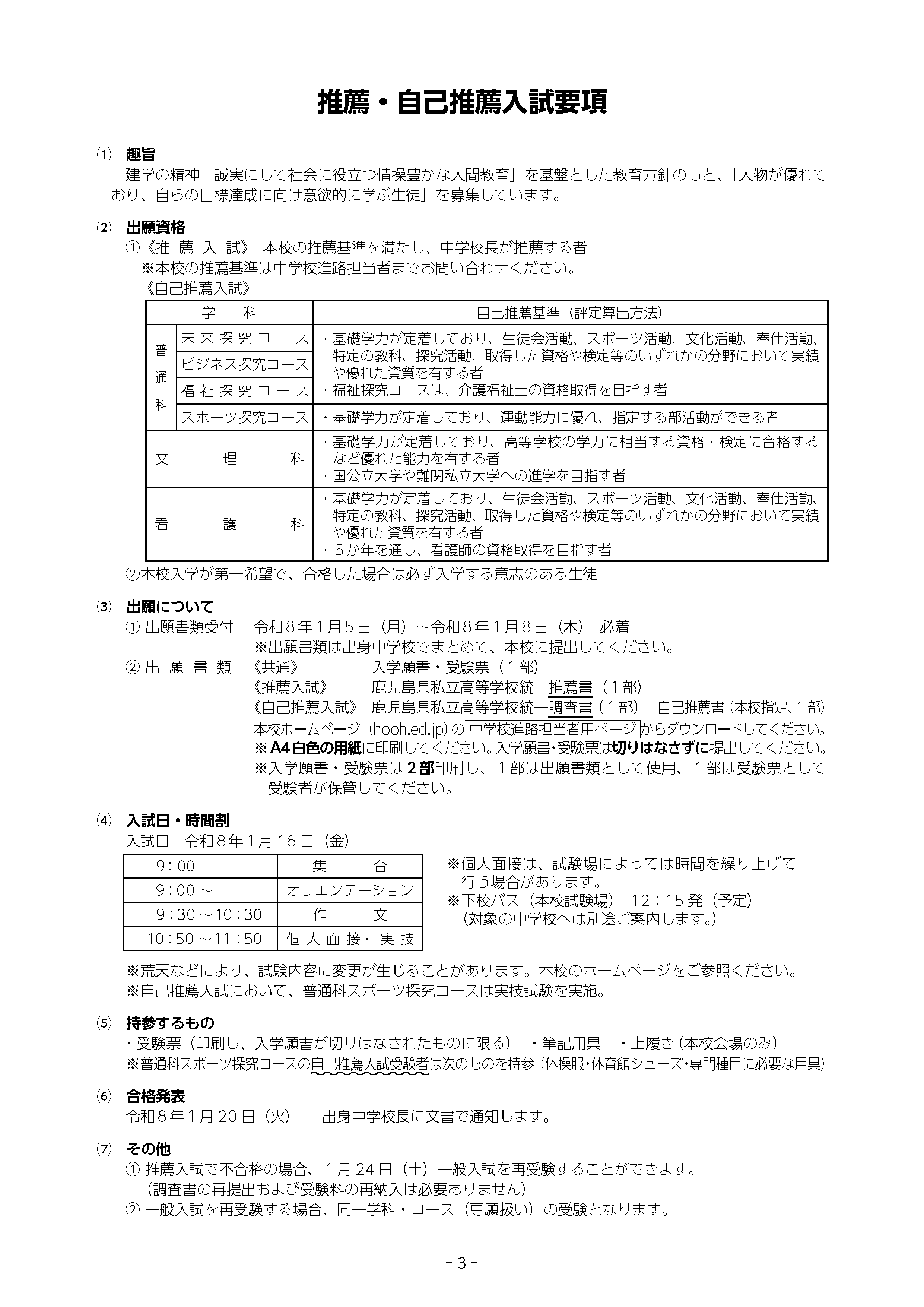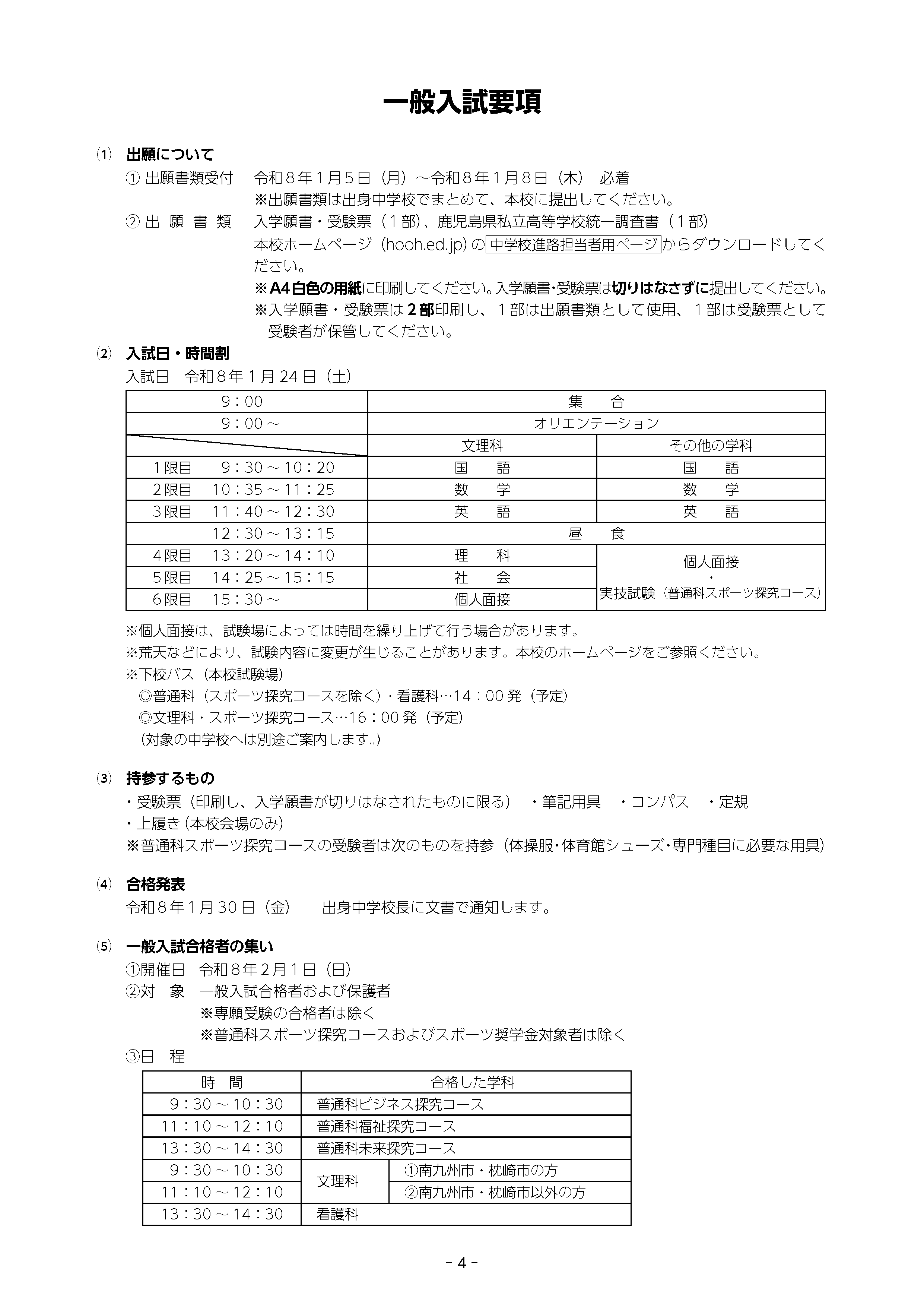 出願書類受付 | 令和8年1月5日(月) ~ 令和8年1月8日(木) 必着 ※出願書類は出身中学校でまとめて、本校に提出してください |